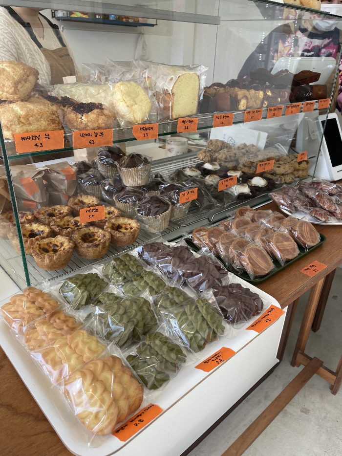 키오 과자점의 시그니처인 베이글 외에도 휘낭시에, 스콘, 파운드, 스모어쿠키, 머핀, 마들렌, 푸딩, 케이크 등 다양한 종류의 디저트들이 가득했습니다.